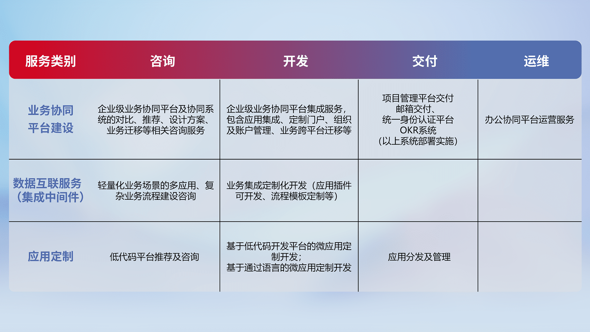 针对钉钉、、、、企微、、IDaas等平台级产品提供产品的规划、、、、方案、、交付、、定制化开发等服务,,实现如统一协同办公、、、、智能客户服务、、、、混合会议管理、、、智能数据查询、、、等业务场景,,,,实现数字化转型。。。